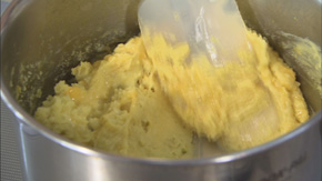 Aの粗熱がとれたら、塩、バター、生クリーム、卵黄、ラム酒を加えてよく混ぜ合わせる。
